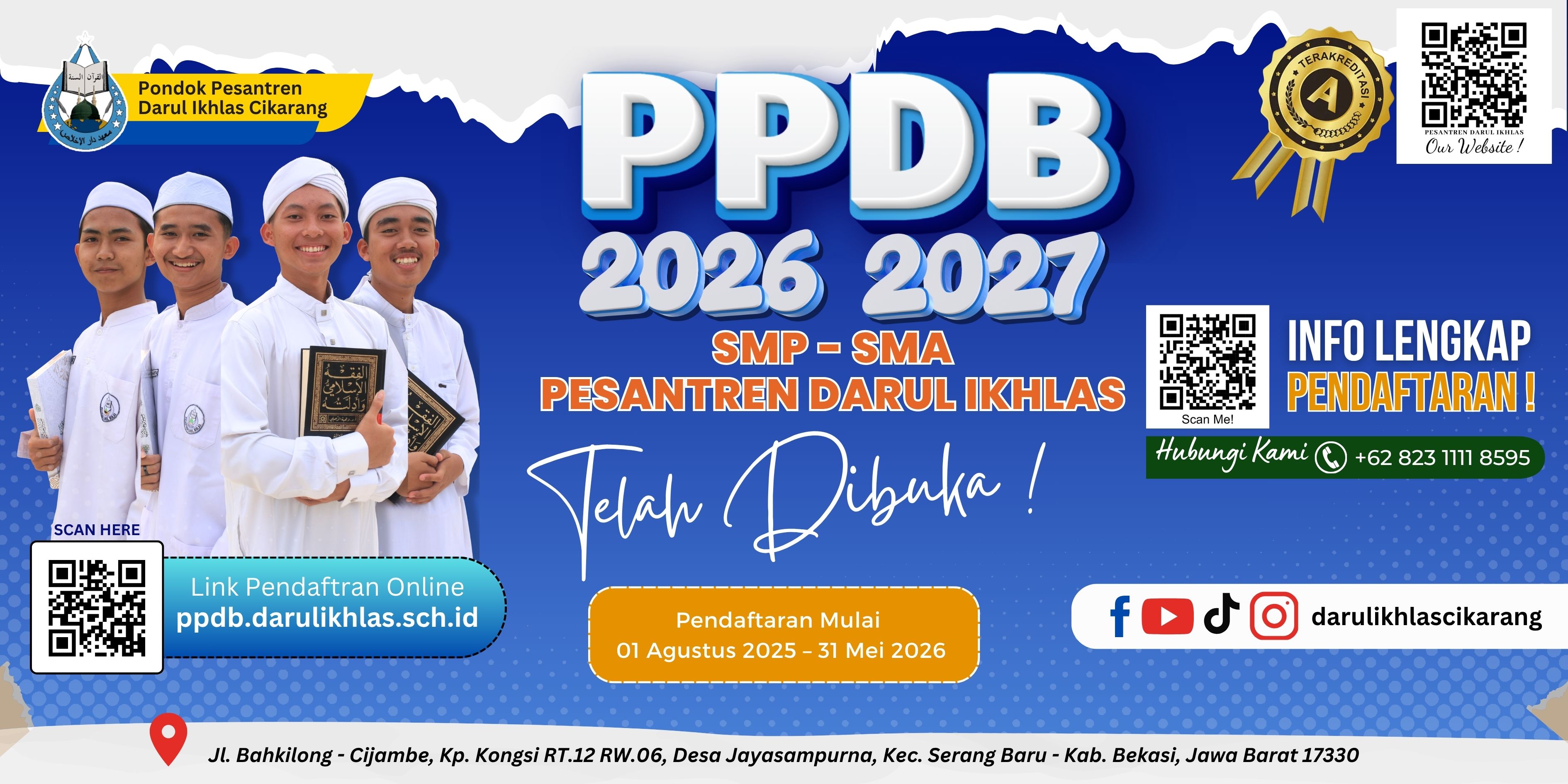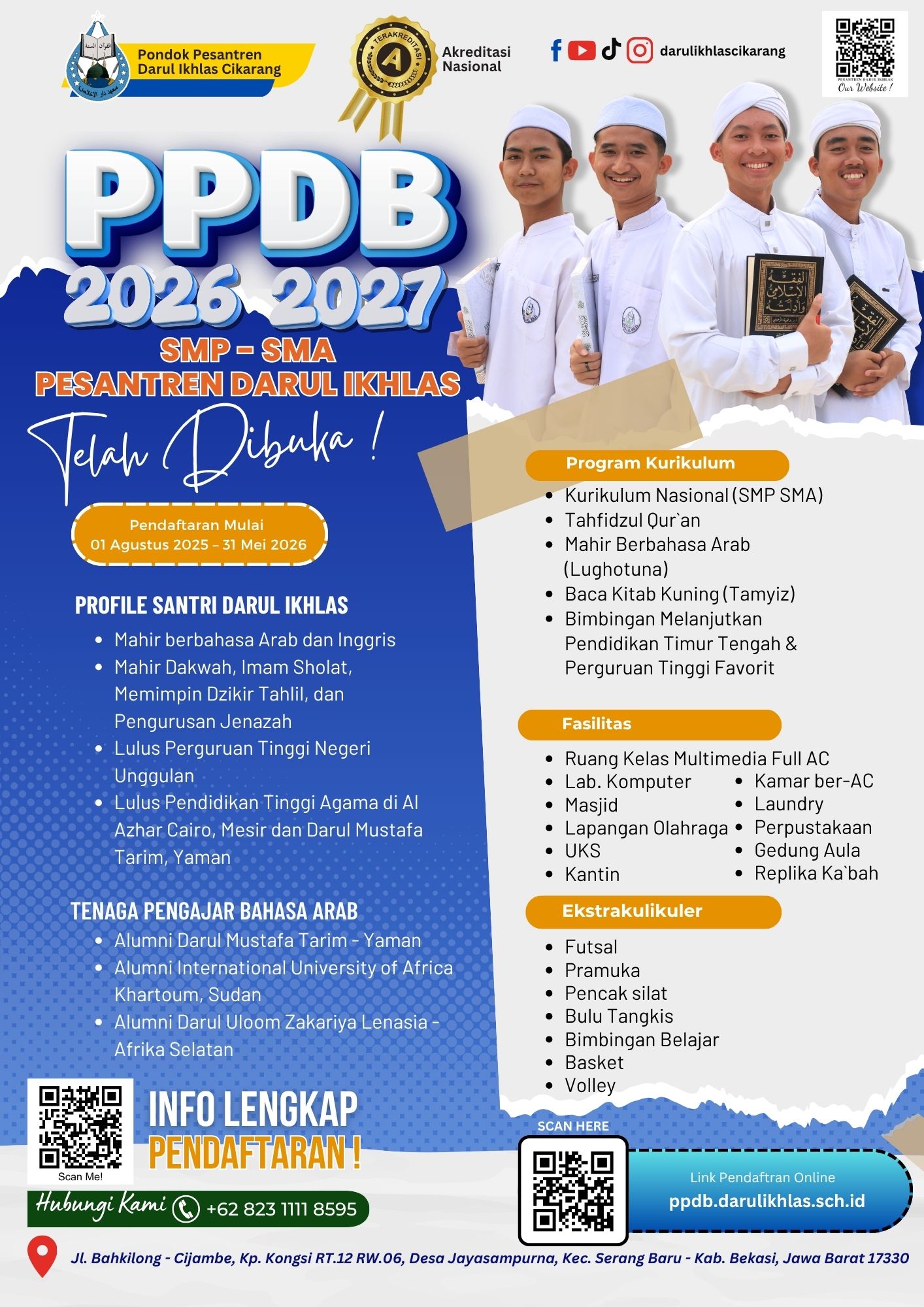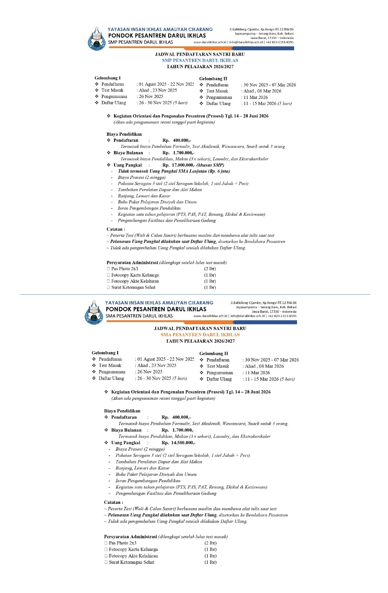 Berikut dibawah ini lampiran Informasi Pendaftaran dari SMP-SMA Pesantren Darul Ikhlas Tahun Pelajaran 2026/2027 ...